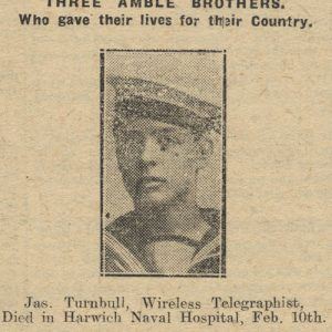 Probate was granted at Newcastle upon Tyne on 29 November 1922, to Jane Rutter Scott (wife of John Robert Scott & Turnbull's older sister) for 'Effects' valued at £48-15s. She secured probate for two brothers on the same day, for both James & Norman. Turnbull's address was given as 11, Plessey Road, New Delaval, Northumberland.