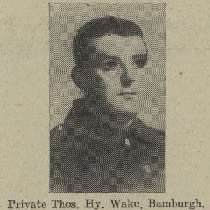 One of two sons lost:  see, also, Private Wilfred Hereward Wake (Regimental service #1598; Northumberland Fusiliers, 1/7th Battalion Territorial Force).  The brothers were killed on the same day as each other.