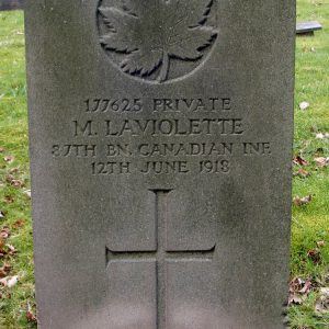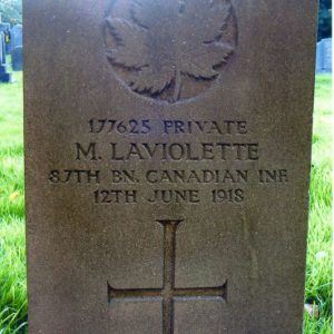 Laviolette is an unusual surname to see in the UK. Only a month before the death of 177625, on 12 May 1918, a Napoleon Laviolette, also serving with the Canadian Infantry (Quebec Regiment) but with the 35th Battalion (Regimental Service #3320614), died at Eastry, Kent, aged 26. He is buried at Walmer (St. Mary) Old Churchyard, Kent. There is no immediate suggestion the two men were related, it will be for others to research, if they so wish.