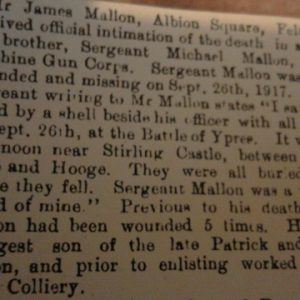 Mallon was promoted to Sergeant & transferred to the Machine Gun Corps. He was killed in action on 26 September 1918.