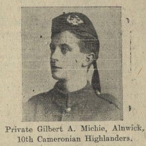 One of two sons lost: see, also, Henry George Michie (Officer of the Northumberland Fusiliers' 15th [Reserve] Battalion, attached to the regiment's 8th [Service] Battalion; Died 26 September 1916).